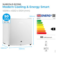 The Subcold Eco50 in white has a storage capacity of 50 litre. It is designed to be used as a top table mini fridge or an under counter fridge. This 50l fridge is suitable for home, commercial and office use. It has well organised storage featuring a removable glass shelf, two door pockets and a small chiller compartment.