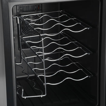 It is tastefully designed for modern living. It features an adjustable digital thermostat with a huge internal temperature range of 5-18°C, perfect for all your favourite wines and drinks! This model measures [W] 345 x [D] 505 x [H] 465 mm with an internal storage capacity of 12 Bottles of wine and features an internal White LED light. Behind the tempered frameless glass door, there are removable internal chrome wire shelves for storage of all your assorted bottles etc.