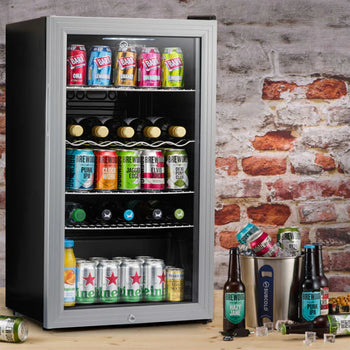 This 85 litre wine & beer fridge is energy-efficient and designed to keep your beverages at just the right temperature. The sleek silver door is outfitted with tempered glass, which allows you to see what is inside without opening the door, and it has a lock and key to prevent unauthorised access when unattended.